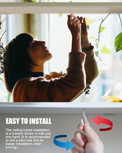 - EASY TO INSTALL : The ceiling hooks installation is a breeze! Screw in with just one hand and also suitable to hang on walls (It is recommended to drill a pilot hole first for easier installation when turning,especially when installing on a wall)