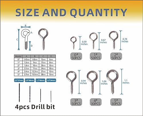 - [Package content]: 260 pcs small eye hooks. Dimensions: 0.59 inches,0.67 inches,0.78 inches,0.94 inches,1.06 inches,1.1 inches+4pcs Drill bit 1.0*34mm,1.5*40mm,2.0*49mm,2.5*57mm