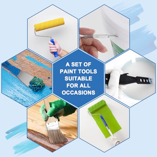 • 【HIGH EFFICIENCY AND ADAPTABILITY】You'll get beautiful finishes and save valuable time and money.9" paint rollers help you get a smooth finish, 4" mini rollers are great for tight spaces.The angle paintbrush is perfect for cutting in walls and flat paint brushe is perfect for trim. The stirring rod helps paint to be more silky smooth and even. The scraper cleans old paint with ease. Can opener opens paint cans without much effort.