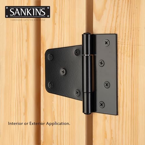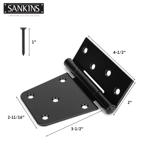 - 【Door Hinges of Premium Structure】 SANKINS gate hinge is made of high quality iron, with a rust resistant black powder coated surface and galvanized to prevent corrosion. It offers the security and stability for long-term outside use, fix a sagging or dragging gate easily and achieves a perfect swinging gate.