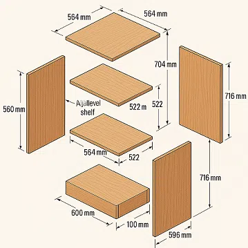 - Widths other than 600 mm: Keep the sides, depth, and height the same; change only the top/bottom/shelf widths to: